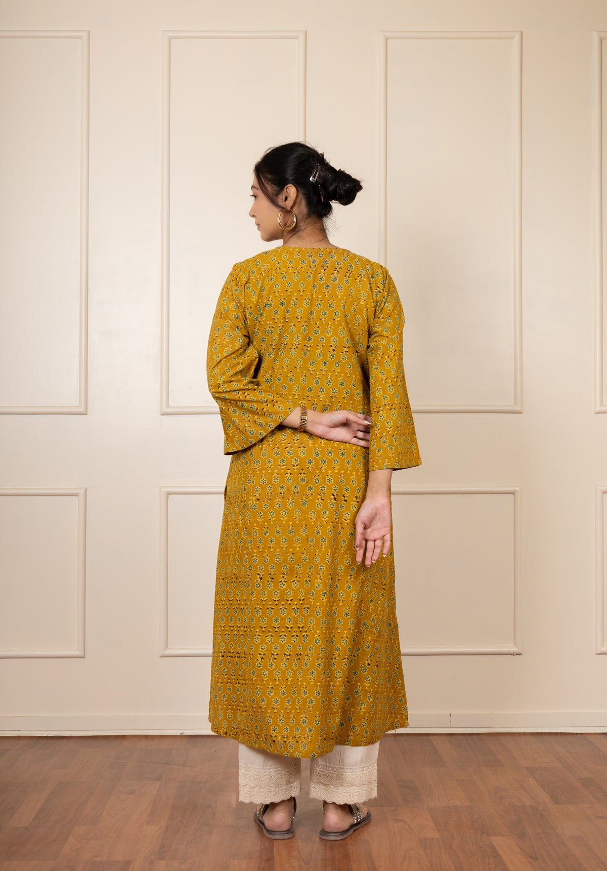 Acacia is a classic kurta for your every day comfort. It has a V neck line, bell sleeves and side slits. A loose fit cotton kurta that is airy and breezy and the mustard shade offers the warmth for the up coming season. Craft engaged to create the fabric is ajrakh from Kutch.